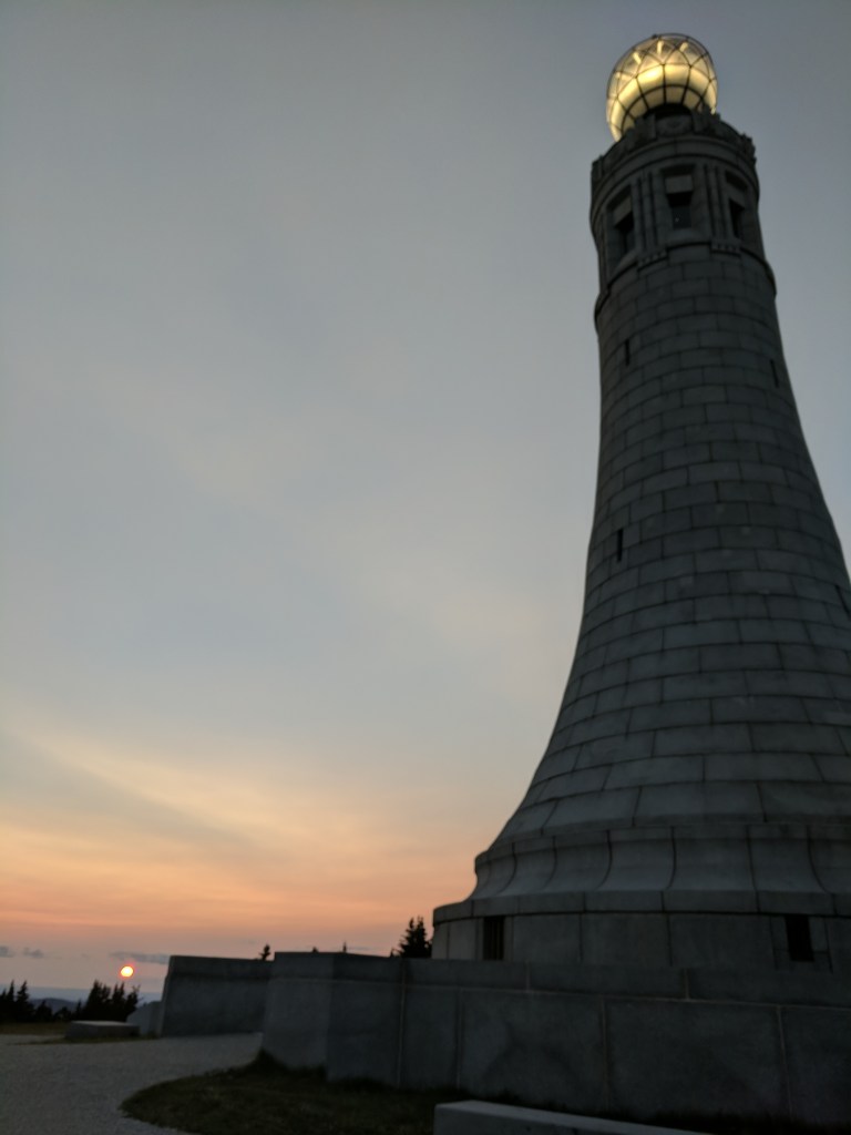The highest point is Mount Greylock, where I viewed a spectacular sunset last night. A plaque at the summit declares the area the only subalpine ecosystem in Massachusetts, yet it is paved with a parking lot and a giant war memorial. Though odd, the glowing orb atop the tower provided a dramatic contrast to the vibrant sunset.